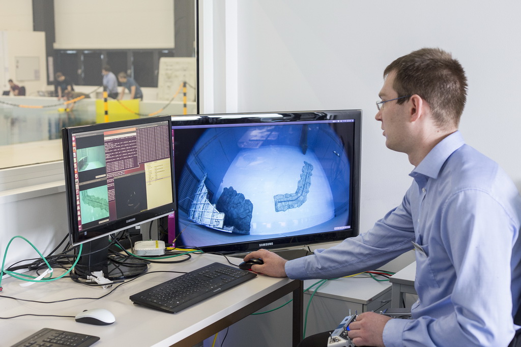 DFKI-Wissenschaftler Matthias Goldhoorn beobachtet die Aktivitäten der Unterwasserroboter im Kontrollraum der Maritimen Explorationshalle. - Datei öffen/herunterladen (jpg, 226.6 KB) -