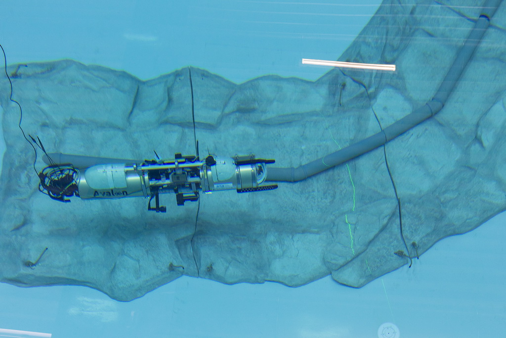 Unterwasserfahrzeug Avalon bei einer Testfahrt durch das Salzwasserbecken, in dem sichNachbauten von Anlagen der Offshore-Industrie befinden: Eine Pipeline am Boden, Teile eines Dreibeins, das ein Windrad im Meer verankert. - Datei öffen/herunterladen (jpg, 198.0 KB) -