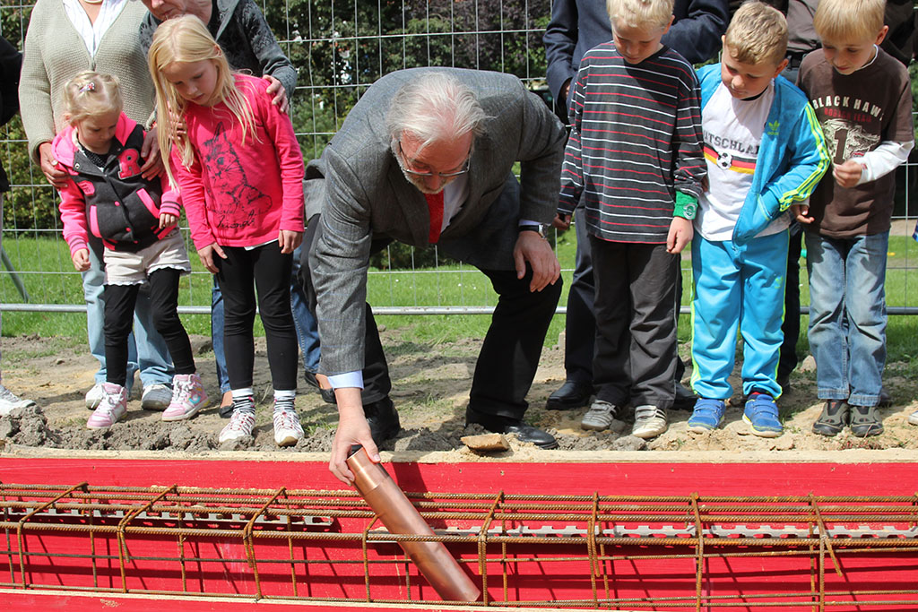 Nach kurzen einführenden Worten legt Stadtrat Klaus Roche eine Kapsel mit Errinnerungen in das Fundament. - Datei öffen/herunterladen (JPG, 297.4 KB) -