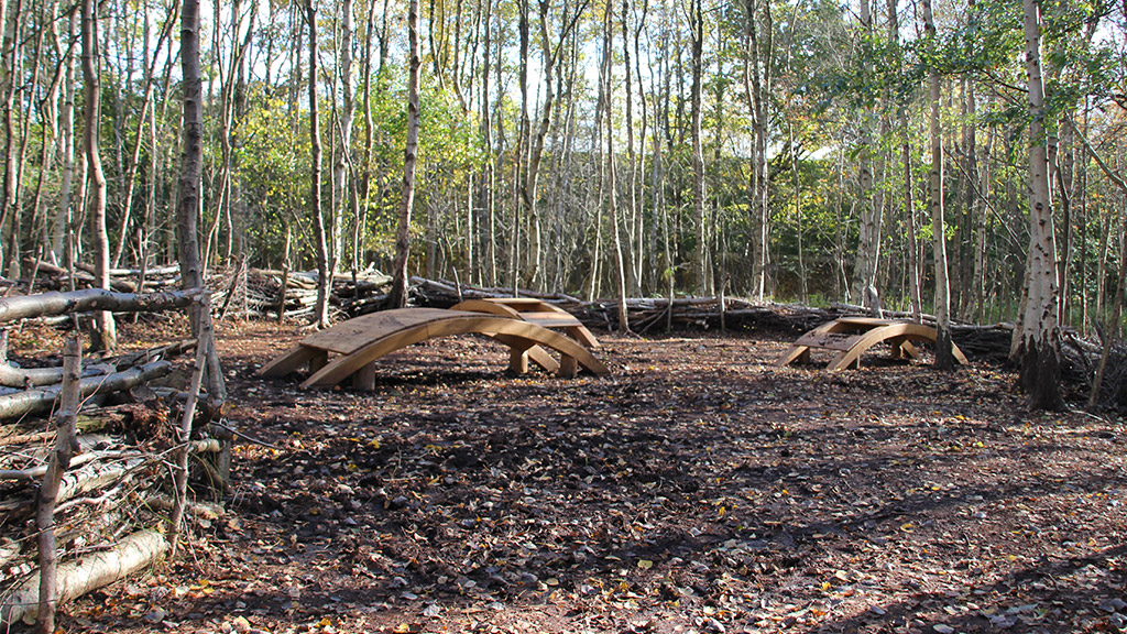 Auf der dritten Lichtung stehen die Bewohner des Waldbodens im Vordergrund. Drei Liegen bieten die Möglichkeit kleine Krabbeltiere zu beobachten und zu erleben wie sich Waldboden anfühlt. - Datei öffen/herunterladen (jpg, 324.9 KB) -
