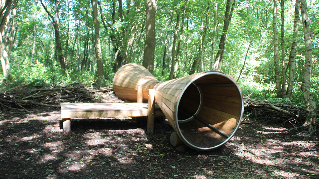 An der zweiten Station befindet sich eine Liege zwischen zwei riesigen Hörtrichtern mit denen die Geräusche des Waldes eingefangen werden können. - Datei öffen/herunterladen (jpg, 338.7 KB) -