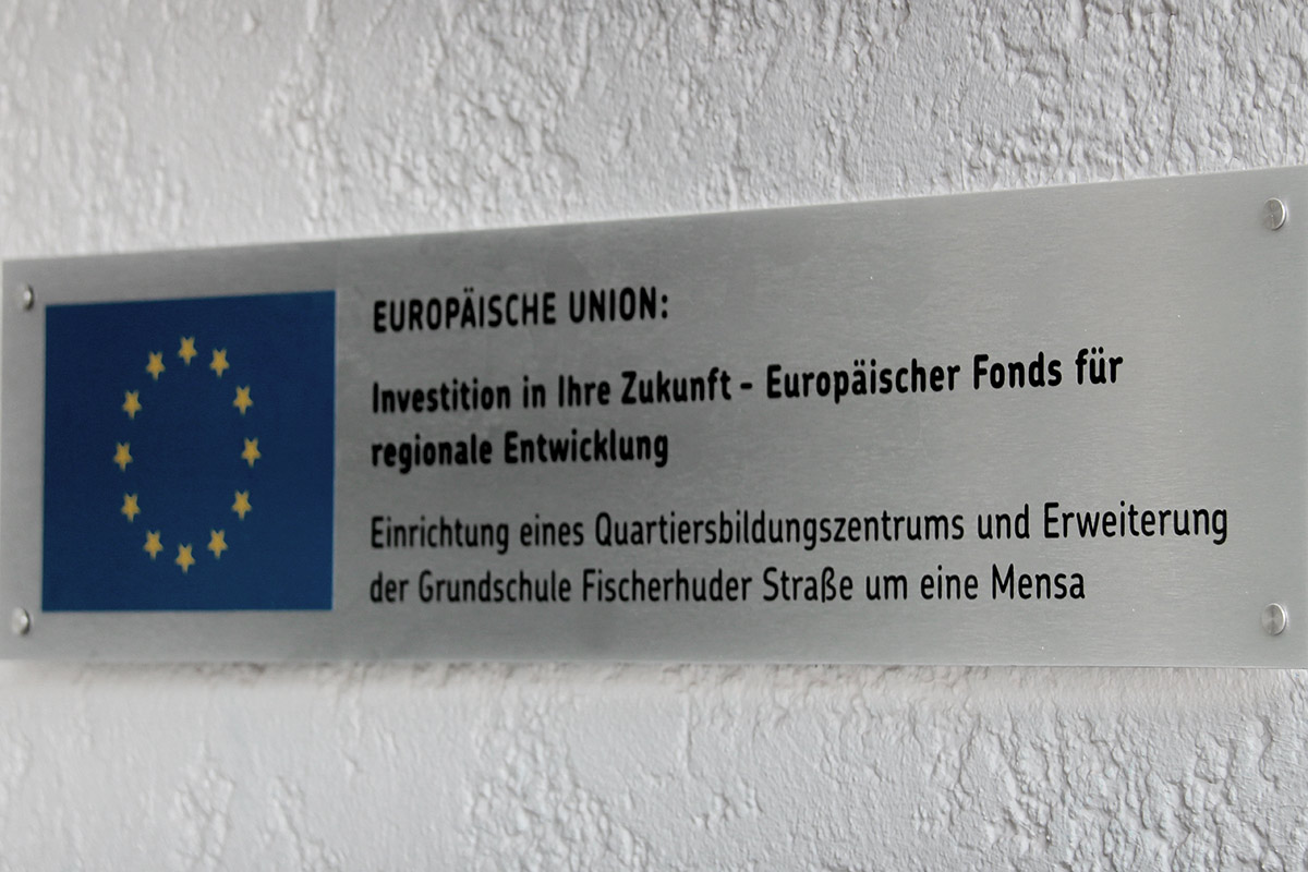 Ein Schild im Eingangsbereich weist auf die Förderung durch den EFRE hin. - Datei öffen/herunterladen (jpg, 179.3 KB) -