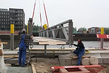 In order to make it easier to reach Überseestadt on foot, a set of steps and a ramp for wheelchair access are being built from the central commercial yard to the lower level of Hafenstrasse. The planned continuation of this path along Waller Wied towards Nordstrasse will substantially improve access from Überseestadt and the Europe Port in particular to the other areas of the district of Walle for pedestrians and cyclists.